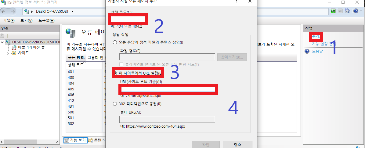 제어판 -> 관리 도구 -> IIS(인터넷 정보 서비스) 관리자 -> 오류 페이지 -> 창 오른쪽 상단에 '추가'