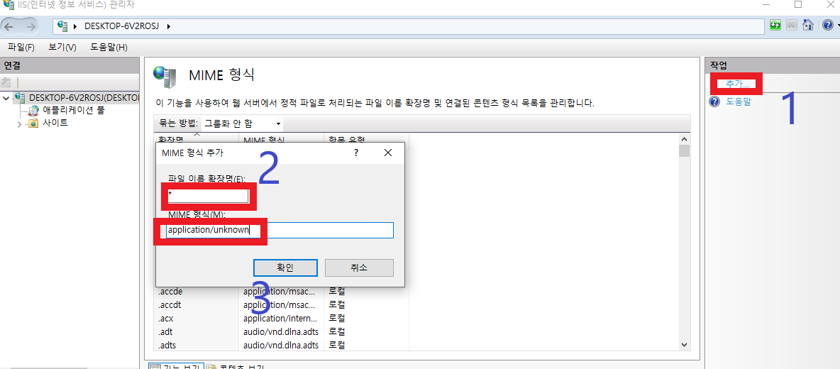 제어판 -> 관리 도구 -> IIS(인터넷 정보 서비스) 관리자 -> MIME 형식 -> 창 오른쪽 상단에 '추가'
